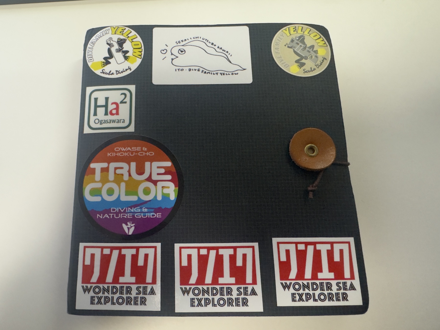 - 表紙にステッカー。潜った海のショップステッカーやお気に入りのイラストを貼るたび、ノートが自分だけの宝物になる